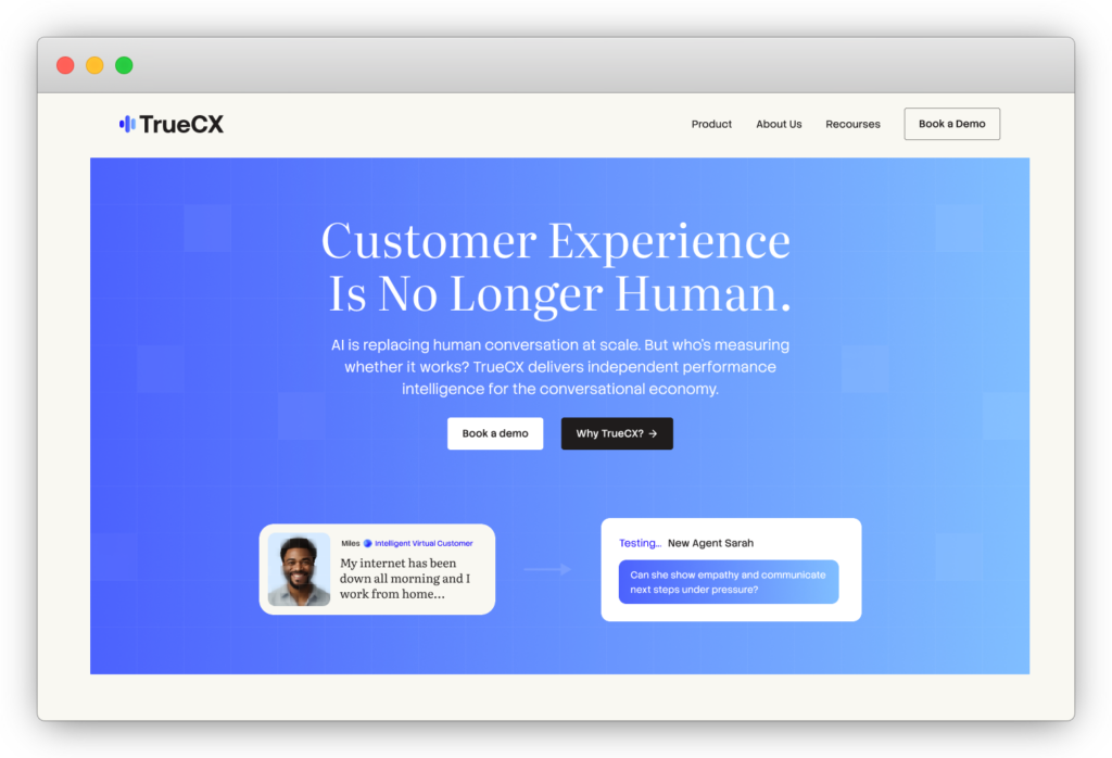 TrueCX is an AI simulation and performance validation platform designed to enable teams to train and test both human and AI agents through realistic, AI-generated customer interactions.